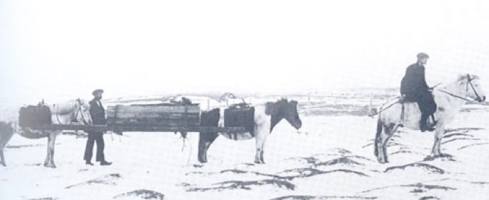Twee IJslandse paarden vormden rond 1900 deze ambulance bij het transport van een doodzieke patiënt naar de hoofdstad.