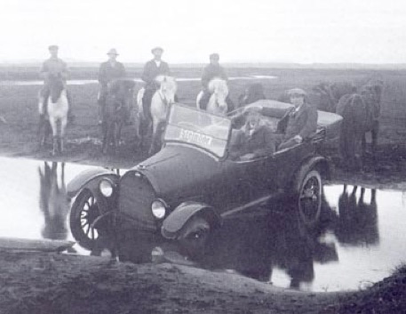 In 1921 ging "Taxicentrale Steindór" uit Reykjavík als eerste van start met een auto op IJsland, een Overland. Ver kwam de taxi niet op weg van de hoofdstad naar de boerderij Friðarstaðir, voor die zich vast reed in de Steinslæk bij Sandhólarferju, bruggen waren daar nog niet..... en toen was het dus wachten op IJslandse paarden die de Overland bevrijdden uit haar benarde positie. Vijf PK bleek voldoende.