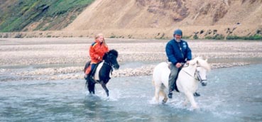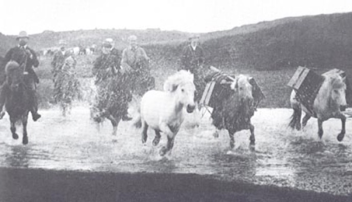 Deze foto uit 1890, genomen in de buurt van de vulkaan Hekla, laat zien dat verhuizen zelfs door de gletsjer-rivieren te paard ging. De paarden kunnen goed zwemmen, hetgeen bij hoog water (dooi en zware regenval) natuurlijk een "must" is.