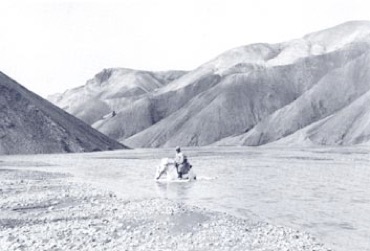 Op de kleurenfoto rijdt Arnold op een schimmel door de gletsjerrivier Jókulsárkvísl.
